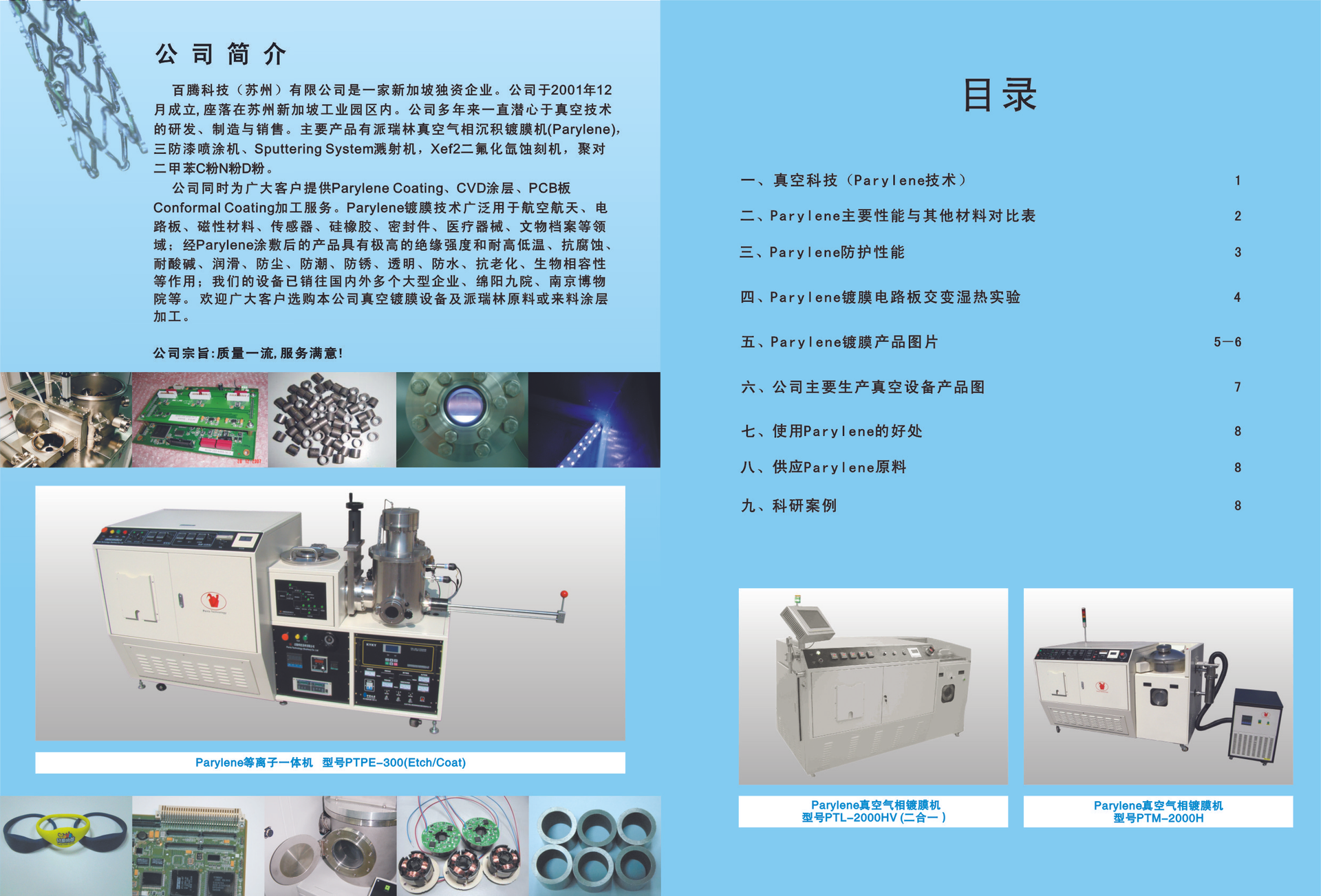主要产品有派瑞林(Parylene)气相沉积涂敷机,Xef2蚀刻机,ParyleneC型N型D型原材料。提供Parylene Coating加工.Parylene是一种高分子聚合物保护材料CVD涂层,其常温下抗老化性能可长达千年以上,透明无色。涂层厚度可以控制在1至100微米之间,涂层后的电子产品具有防水、防尘、绝缘、耐高温、耐摩擦、抗酸碱腐蚀等作用。百腾科技(苏州)有限公司欢迎广大客户订购PARYLENE涂层设备或来料涂敷加工.